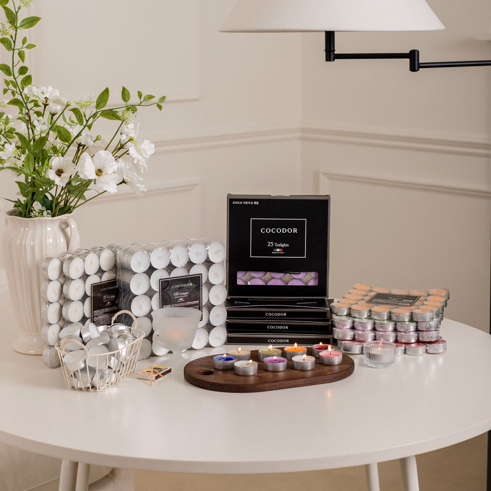 ティーライト キャンドルは屋内および屋外のイベントに最適です。スパ、バスルーム、ヨガ ルーム、寝室で使用できます。ガラス製のティーライト ホルダーにもぴったり収まります。